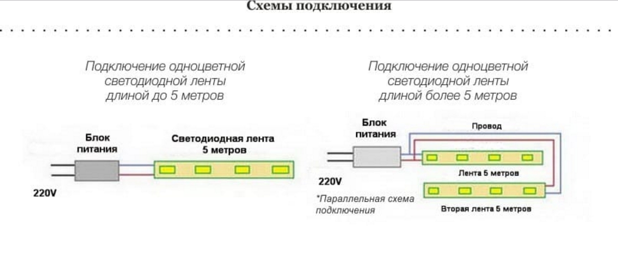 Le raccordement de plusieurs bandes LED s'effectue en parallèle afin que la puissance du flux lumineux ne baisse pas.