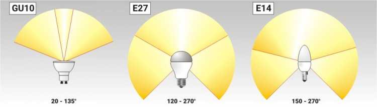 Il est difficile de comparer le niveau de puissance lumineuse de différentes lampes. Par exemple, une LED de 5 mm émet de la lumière à 1-5 lm, et une lampe à incandescence de 70 W donne 750 lm. L'angle de diffusion est sélectionné en fonction de la surface de la pièce. Dans le couloir, il y a assez de diode à 30°, dans la pièce il vaut mieux utiliser des éléments à 90-120° ou plusieurs en même temps. L'angle maximal des luminaires LED est de 120 °. L'endroit le plus éclairé est le centre, vers la périphérie la lumière est diffusée.