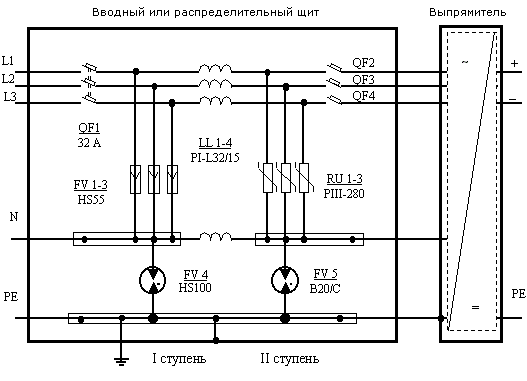 Les appareils sont installés parallèlement au réseau principal devant le générateur auxiliaire, le compteur et d'autres équipements. Pour éviter les conséquences d'un éventuel court-circuit à la terre, un disjoncteur est utilisé devant le parafoudre.