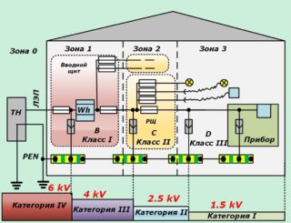 Le schéma de raccordement du parafoudre a ses propres caractéristiques pour les réseaux monophasés et triphasés, principes de mise à la terre TNC et TNS (combiné ou non, conducteur principal et de protection).