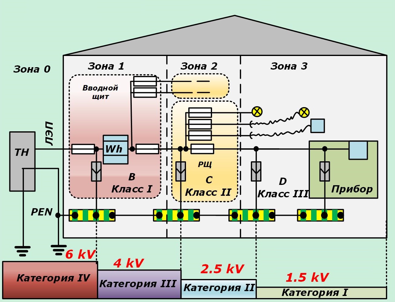 - La classe C gère les surtensions de commutation et les orages qui ont dépassé le premier niveau de protection. L'appareil est placé dans le tableau général à l'intérieur du chalet ou dans une annexe-garage, entrée d'un immeuble à plusieurs étages, à l'étage du bâtiment administratif.