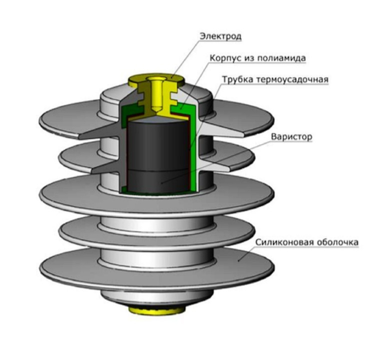 Le parafoudre se compose de plaques de résistance de section circulaire (le nombre est basé sur la surtension de conception), qui sont empilées dans une colonne, placées dans un tube en fibre de verre et cousues dans une gaine isolante nervurée. L'étanchéité assure le remplissage des vides avec un composé visqueux silicium-organique. La structure est fermement serrée par des brides des deux côtés. La particularité de l'appareil réside dans la mise en œuvre d'une sortie rapide et sûre d'énergie thermique dans l'environnement - lors de la réception de l'impulsion, la température de la varistance atteint 100-150°C.