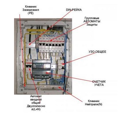Le dispositif de distribution d'entrée est installé sur un poteau, à partir duquel l'électricité est fournie. De la ligne électrique, un câble est tiré à travers le blindage jusqu'à la maison, et ce n'est qu'alors que les groupes électriques sont câblés. La législation prévoit la division du panneau en dispositifs d'entrée et de distribution de l'alimentation électrique.