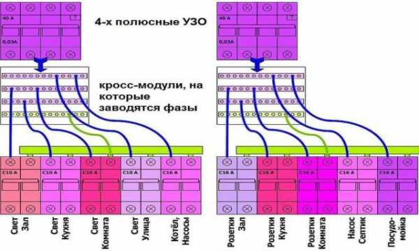 Le circuit peut être assemblé à partir de RCD bipolaires et de modules croisés après chacun. La charge, répartie sur les phases, alimente les sorties des dispositifs à courant résiduel. Il y aura trois bus neutres et de mise à la terre - selon le nombre de disjoncteurs différentiels.