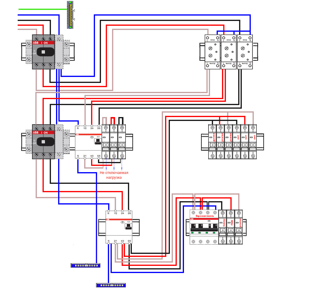 Grâce au module croisé, la charge est divisée en difavtomats. La connexion se fait comme ceci :