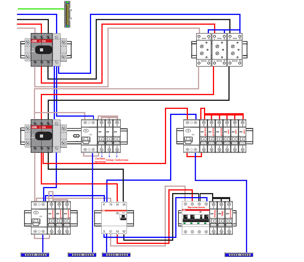Avant le travail, vous devez calculer les coûts pour chaque nœud, en tenant compte du coût d'un rail DIN, d'un bus, d'un câble. La mise en œuvre d'une carte d'introduction à plus de 3 RCD, conçue pour 380 Volts, présente plusieurs nuances :