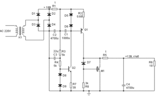 - Avec boucle de réglage automatique. Le dispositif de compensation fonctionne sur le principe de l'égalisation des valeurs de sortie et de référence. Une partie de la tension de sortie est retirée du diviseur résistif, puis comparée à l'aide d'une diode Zener. La boucle de contrôle est une boucle de rétroaction à 180 degrés. Le courant est stabilisé par une résistance ou une alimentation.
