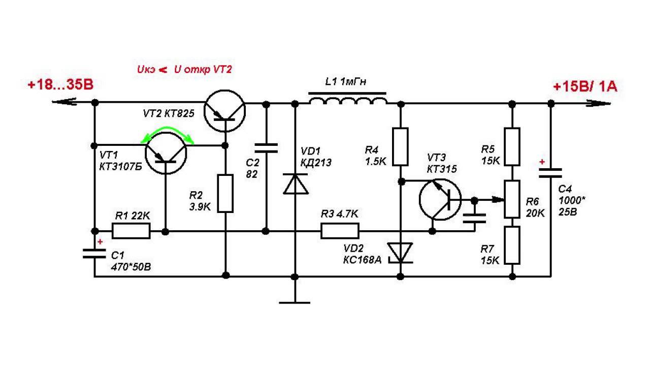 Le dispositif à impulsions se caractérise par un rendement élevé même dans des conditions d'une large plage de tension. Le circuit du dispositif comprend une clé, un accumulateur d'énergie et un circuit de commande. L'élément de réglage est connecté en mode impulsion. Le principe de fonctionnement de l'appareil :