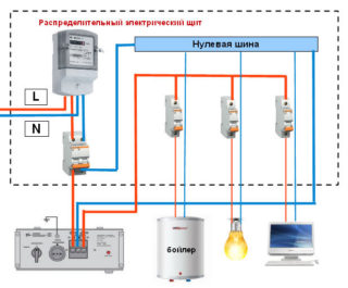 Le stabilisateur est entré dans une maison privée à l'aide d'un câble VVGng à trois conducteurs, d'un interrupteur à trois positions et d'un fil PUGV. L'installation s'effectue avant le compteur, dans un tableau séparé ou de distribution :