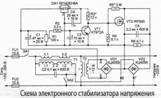Pour l'autoproduction, il est conseillé d'utiliser un circuit triac - un appareil efficace. Il égalise la puissance nominale du courant fourni à des tensions de 130 à 270 V. L'appareil peut être fabriqué sur la base d'une carte de circuit imprimé en textolite en feuille. Le montage de l'appareil s'effectue comme suit :