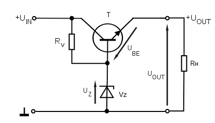 Lorsque le courant de collecteur est appliqué à la résistance, la tension chute et a une polarité inversée pour l'ensemble émetteur. Il en résulte une baisse des courants collecteur et émetteur. Pour rendre l'ajustement en douceur, un diviseur est utilisé pour la ligne de stabilisation. La régulation échelonnée est réalisée à l'aide de la tension du support de la diode Zener.