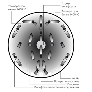 - En raison de la température élevée, les atomes du filament de tungstène commencent à s'évaporer. Mais ils réagissent avec le brome ou l'iode et ne se déposent pas sur le verre de l'ampoule, comme cela arrive dans les lampes à incandescence ordinaires, mais retournent dans la spirale.