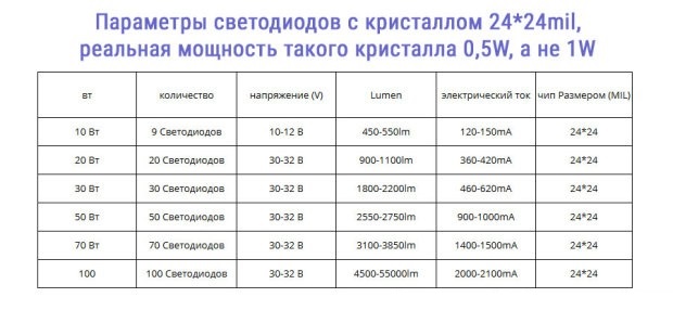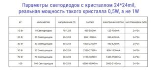 Une caractéristique des cellules à semi-conducteurs est la puissance, qui dépend de l'amplitude de la tension. L'intensité du courant est de 3000 mA. Les fabricants produisent des lignes de LED multipuces alimentées de 6 à 72 V. Classification :