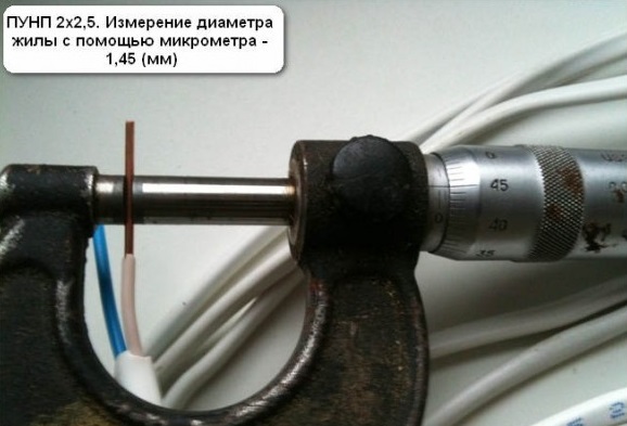 Lors des opérations d'installation, si possible, d'autres types de câbles sont sélectionnés, qui sont les analogues les plus proches de PUNP (VVG ou PVS, par exemple). Mais s'ils n'étaient pas retrouvés, vous devrez vous contenter de ce que vous avez, en prenant des précautions prédéterminées. Pour ce faire, tout d'abord, le diamètre des noyaux est mesuré à l'aide d'un pied à coulisse. Ensuite, une formule est utilisée pour calculer la section transversale du PUNP, selon laquelle le carré de la valeur obtenue après la mesure est multiplié par un facteur de 0,785.