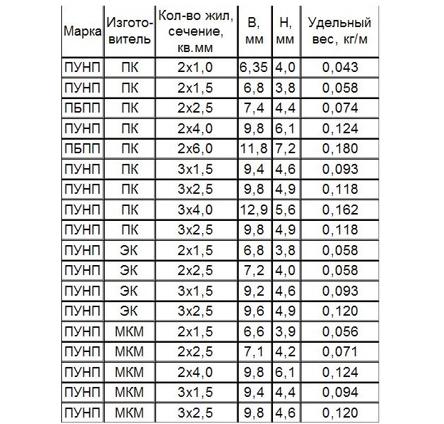 Les caractéristiques du dispositif PUNP incluent également un choix limité dans le nombre et la section des conducteurs. Le nombre de noyaux individuels ne dépasse pas 3 et leurs sections transversales correspondent à la plage de valeurs de 1,5 à 6 mm de côté.