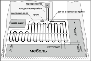 L'installation de câbles chauffants des deux types et des tapis est réalisée à l'aide d'une technologie similaire et comporte une étape préparatoire générale. Les nuances de conception du système affectent les connexions électriques.