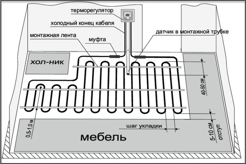 Avant le début des travaux d'installation, un schéma de pose est établi. Il montre l'emplacement du câble (tapis), l'endroit où le thermostat est connecté. Le schéma prend en compte la distance recommandée des murs de 50 à 100 mm. Les zones occupées par des meubles sans pieds, sur lesquelles les éléments chauffants ne peuvent pas être placés, sont marquées.
