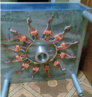 - Les bobines avec aimants sont montées sur un cadre métallique pré-soudé de telle sorte qu'un petit espace reste entre leurs plans.