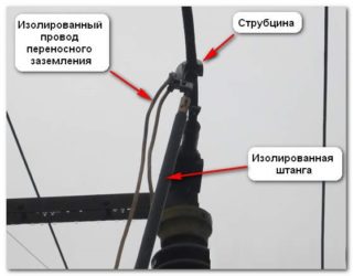 La structure temporaire de mise à la terre des lignes électriques diffère des options de mise à la terre en utilisant de longues tiges. Aussi, aux extrémités des conducteurs, à la place des pinces, des crochets de préhension seront placés. Il n'y a pas de mise à la terre standard lorsque vous travaillez sur le terrain, une conception portable est donc également utilisée pendant une certaine période. Habituellement, l'ensemble requis est inclus dans le kit.