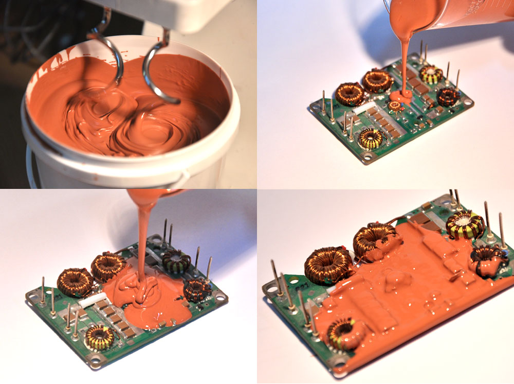 À l'avenir, une fixation fiable de l'ensemble de l'ensemble est assurée par un composé liquide versé dans la boîte, préparé à l'avance dans un récipient approprié. Après durcissement, vous obtenez une structure monolithique, qui n'est pas inférieure aux meilleurs designs industriels en termes de protection contre les vibrations et autres influences. Son seul inconvénient est l'impossibilité de démontage en vue d'une réparation ultérieure du circuit.