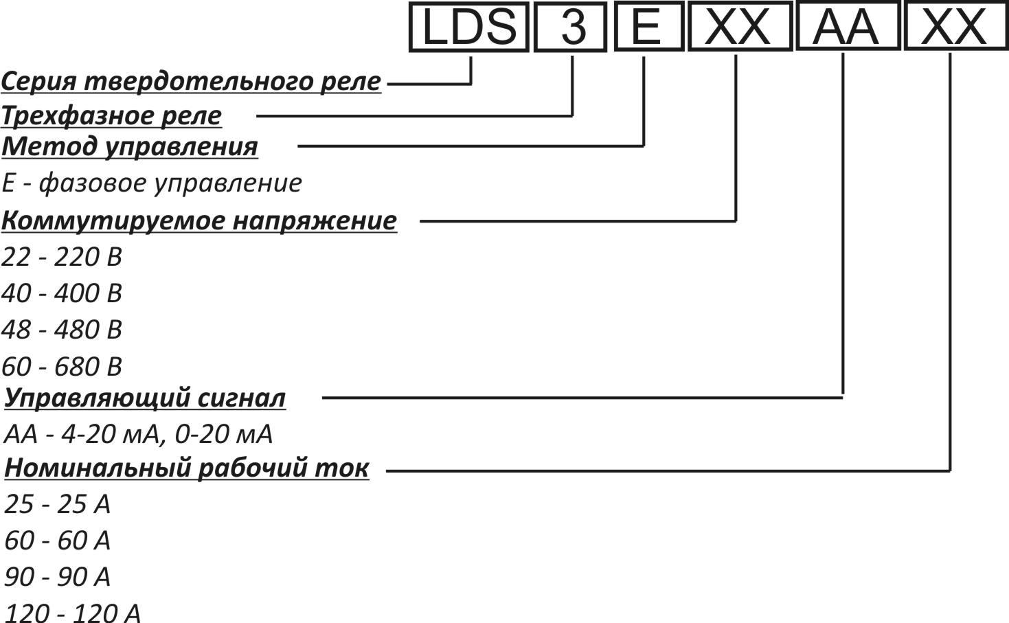 La désignation est écrite comme SSR -40 D A H. SSR ou TSR indique le nombre de phases. 40 - charge en Ampères. La lettre désigne le signal à l'entrée (L 4-20 mA, D - 3-32 V en courant continu, V - résistance variable, A - 80-250 V en courant alternatif). La lettre suivante est la tension d'entrée (A - AC, D - DC). La dernière lettre est la plage de tension de sortie (N - 90-480 V, aucune lettre - 24-380 V).