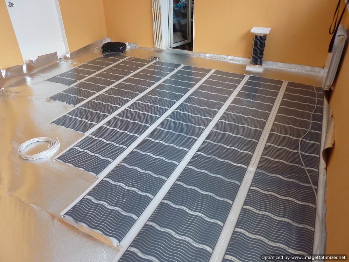 L'installation d'un chauffage au sol infrarouge commence par l'installation d'un thermostat dans une boîte de jonction. Les fils sont reliés au blindage. Une couche d'isolation thermique d'une épaisseur maximale de 5 mm est posée sur la base. Les joints doivent être fixés avec du ruban adhésif. Le film IR est déposé par des éléments chauffants. Ses bords doivent être renforcés avec du ruban adhésif afin qu'aucun décalage ne se produise. Les contacts et le fil doivent être connectés. Dans la deuxième section, un capteur thermique est installé pour recevoir des informations sur le chauffage. La dernière étape consiste à vérifier le fonctionnement du système, à poser la bâche plastique et la couche de finition.