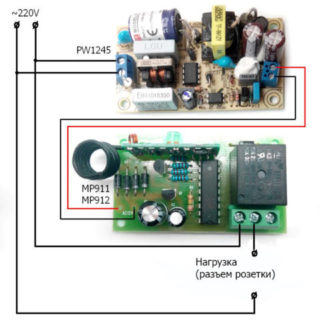 - A ce stade, le relais du récepteur et l'alimentation sont connectés à un réseau 220 V. Si la prise fonctionne selon le principe d'un adaptateur, elle est connectée à une prise ou à un cordon. S'il est intégré, passez directement par le commutateur.