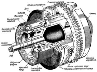 Lorsque le rotor tourne, qui est un électro-aimant avec un noyau et un enroulement d'excitation, connecté à une source d'alimentation externe à l'aide d'un mécanisme à balais, une force électromagnétique est induite dans l'enroulement du stator, qui est alimentée aux bornes de sortie du générateur. Cette conception élimine le besoin de contacts glissants, ce qui simplifie grandement la conception de l'unité. Initialement, le flux magnétique est excité à partir d'un excitateur tiers attaché à un arbre commun et connecté au système à l'aide d'un couplage.