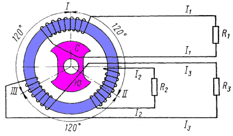 Structurellement, un générateur électrique triphasé comporte trois enroulements indépendants situés dans le stator dans un cercle avec un décalage de 120 ° les uns par rapport aux autres. Dans ce cas, chaque enroulement est un générateur monophasé, capable de fournir une tension alternative au consommateur R. Un tel enroulement unique est appelé "phase". Les enroulements de phase peuvent être interconnectés par "delta" ou "étoile".