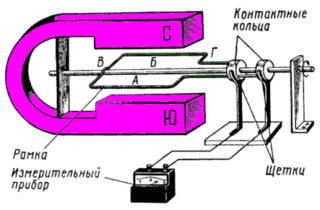 En rotation, les moitiés du cadre passent successivement près des pôles de l'aimant. Dans ce cas, un changement cyclique dans la direction du mouvement du courant émergent se produit - à chaque pôle, le courant se déplace dans un sens.