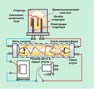 Lorsque la lampe fluorescente est allumée, une augmentation du courant semblable à une avalanche est observée, ce qui provoque une diminution de la résistance. Par conséquent, il est impossible de connecter un tel consommateur directement au réseau. Pour un fonctionnement efficace et à long terme de l'ampoule, il est nécessaire d'éviter la surchauffe des électrodes. Pour cela, un ballast ou starter est utilisé. Il produit une charge supplémentaire lorsqu'il n'y en a pas assez dans le réseau, ce qui limite la quantité de courant.