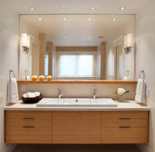 Si la pièce est petite avec des plafonds bas, vous devrez utiliser des projecteurs intégrés et éclairer en plus la zone du miroir afin qu'il soit pratique d'organiser des événements cosmétiques.