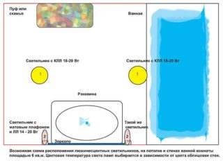 Dans une grande salle de bain, il est conseillé de prévoir un éclairage ponctuel. Premièrement, il est beau et deuxièmement, il économise de l'énergie. Pour les jeunes enfants, vous pouvez toujours laisser la petite ampoule allumée afin qu'ils ne touchent pas les prises et les interrupteurs. Les espaces les plus fonctionnels sont une salle de bain ou une douche, un local pour le tri du linge, un lavabo.