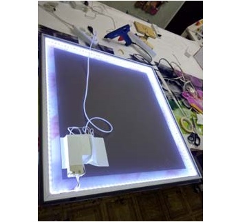 Tout d'abord, une boîte est construite dans laquelle un miroir est placé. Il devrait y avoir un endroit à l'arrière pour fixer la bande et l'unité de contrôle. Il est collé à n'importe quel coin derrière le miroir.
