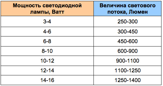 L'efficacité des sources LED est bien supérieure à celle de tous les analogues disponibles. Pour déterminer la puissance du flux lumineux, on prend l'équivalent de sa correspondance avec une lampe à incandescence classique. Selon la qualité et le niveau de température de couleur du produit, le rapport est de 1: 6-10.