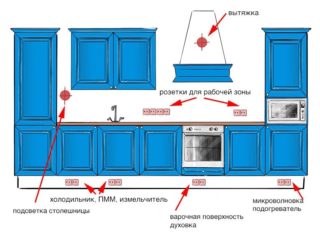 - Le nombre de prises doit être supérieur de 25 % au nombre d'appareils électriques dans la cuisine. Ainsi, une réserve sera faite pour brancher des appareils supplémentaires : un aspirateur de cuisine ou un ventilateur. Exemple - 10 prises devront être installées sur 8 unités d'équipement.