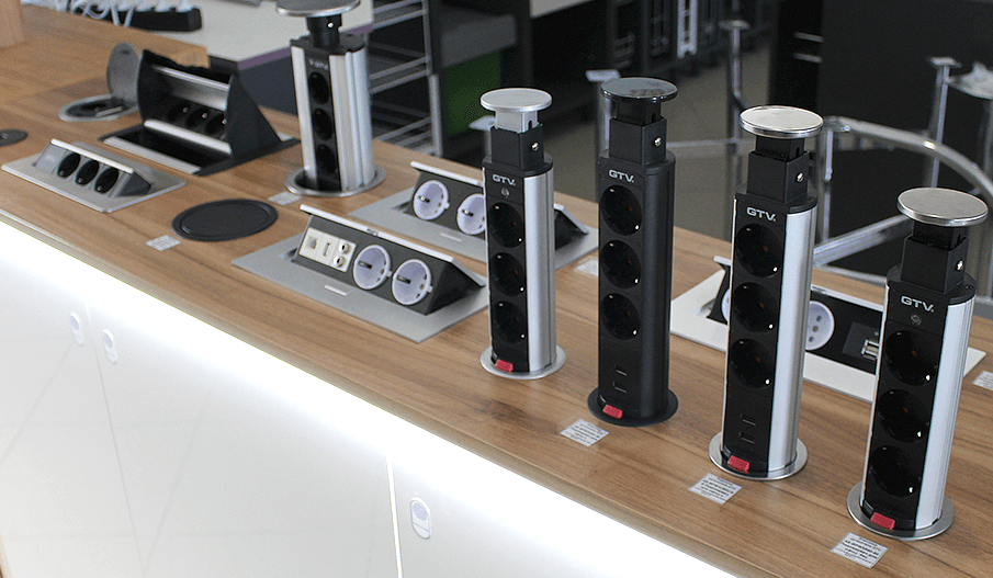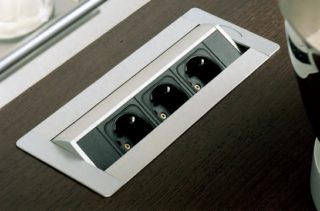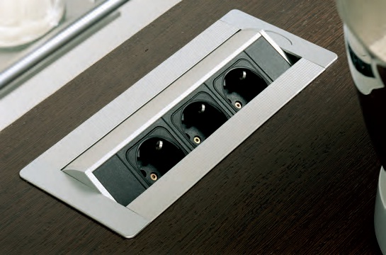Prises encastrées dans un plan de travail - un bloc de 2 prises ou plus montées dans un boîtier en métal ou en plastique, équipé d'un mécanisme coulissant. L'appareil se retire du plateau par une légère pression et s'y plonge tout aussi facilement lorsqu'il est pressé. Un appareil de ce type est une sorte de parasurtenseur, mais en même temps, il n'a pas de faisceaux de câbles qui n'ont pas l'air si esthétiques. Le marché moderne offre aux utilisateurs plusieurs variétés de dispositifs coulissants.
