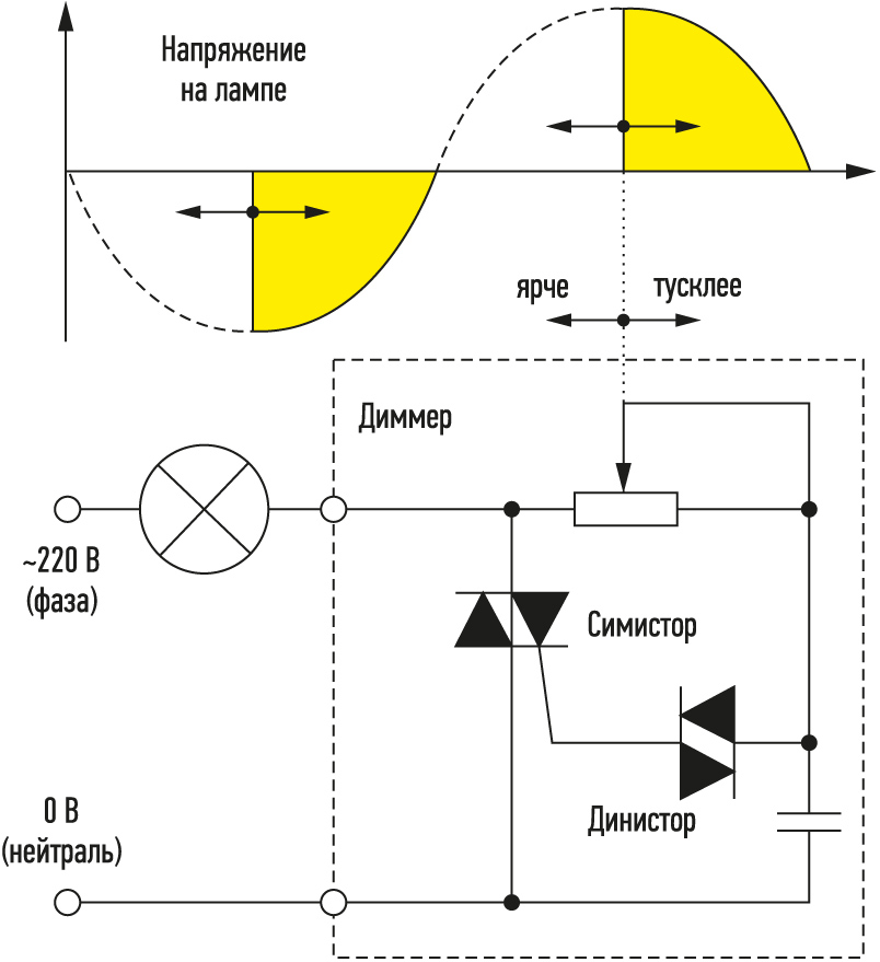 Le fonctionnement de l'appareil est basé sur le principe de dépendance linéaire de la luminosité de la lumière à la tension. Vous pouvez réduire la puissance du flux lumineux en abaissant le niveau de tension dans le réseau. Cette tâche est attribuée au gradateur - gradateur. Sa conception ne laisse passer qu'une partie de l'onde pulsée ou la totalité de l'onde vers la lampe, réduisant ou augmentant ainsi l'éclairage.