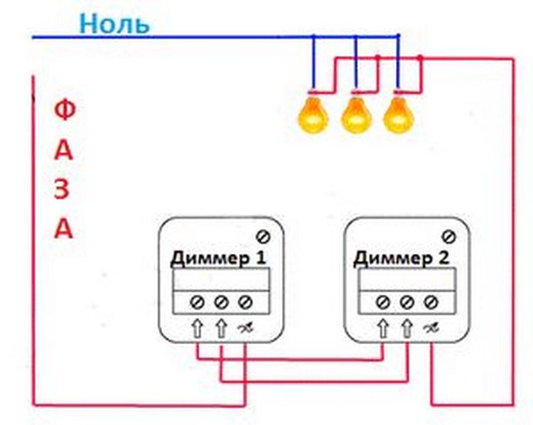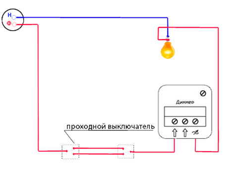 - Disons l'option lorsque la régulation de la lumière est effectuée à partir d'un endroit et le contrôle - à partir de deux. Il peut s'agir d'un interrupteur à l'entrée et de deux régulateurs dans différentes zones de la pièce.