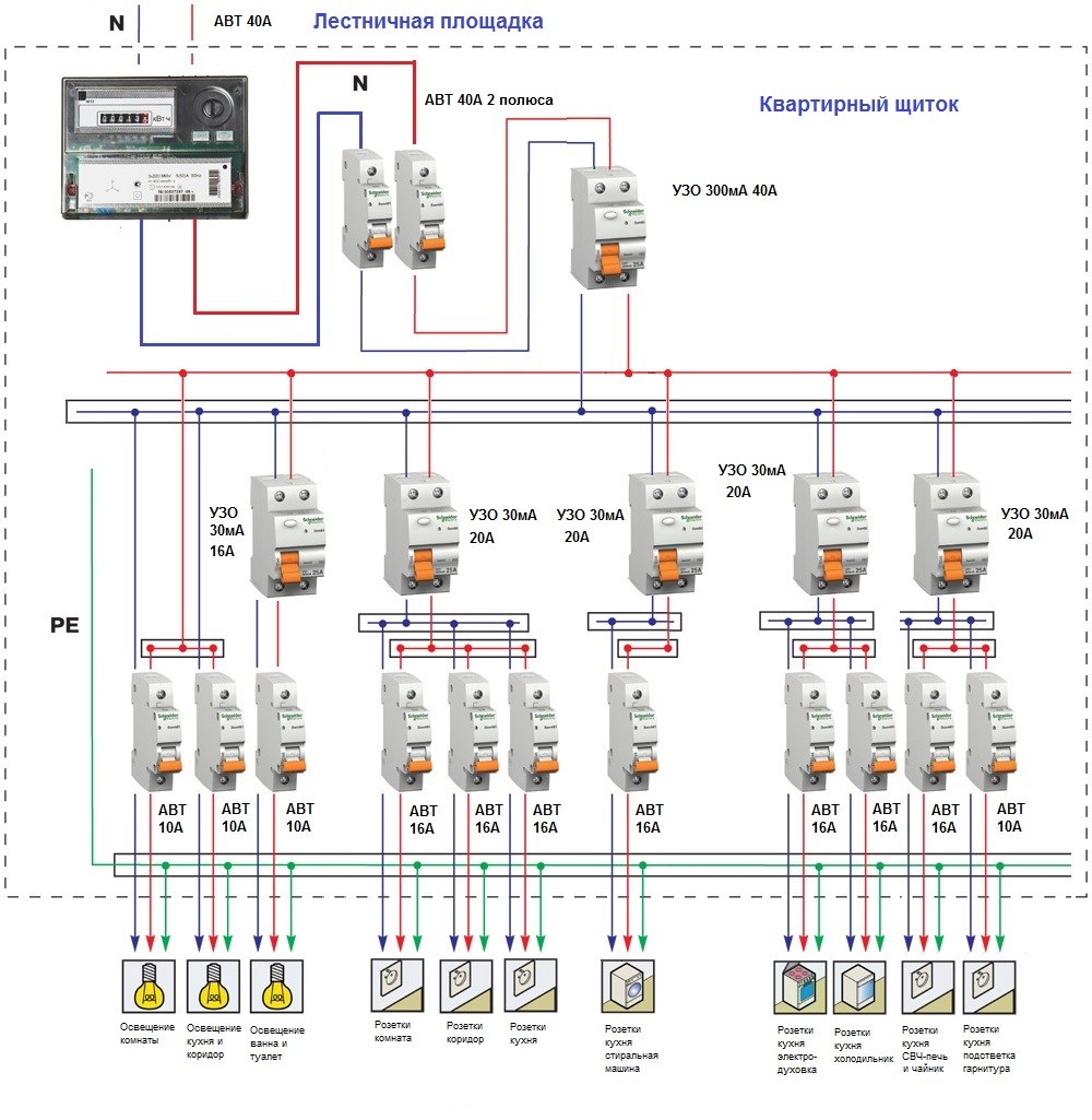 Dans les maisons anciennes, il y a un standard électrique à chaque étage, où il y a un compteur, un commutateur de paquets et des disjoncteurs. Par conséquent, lorsqu'un schéma de câblage est conçu dans un appartement de deux pièces, il convient de créer un circuit d'alimentation et d'éclairage indépendant, en planifiant les branches principales et supplémentaires. À Khrouchtchev, il est permis d'utiliser les options de connexion suivantes :