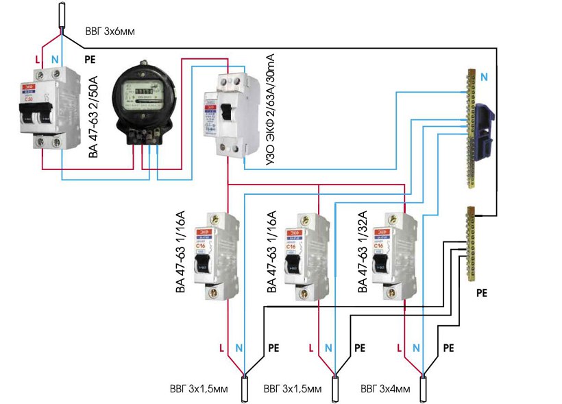 - Parallèle - l'énergie est fournie au consommateur à partir d'une source d'alimentation via sa propre ligne. Un câble à trois conducteurs est connecté à un appareil monophasé, un câble à cinq conducteurs avec des fils de phases A, B, C, zéro et la terre à l'appareil triphasé. Un tel schéma prévoit l'organisation de sa propre ligne pour chaque consommateur et l'installation d'un RCD individuel.