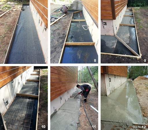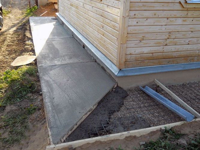 - Utilisez-le comme chemin le long duquel vous pouvez marcher et faire rouler une brouette. Avec une épaisseur suffisante, la zone aveugle en béton autour de la maison peut être utilisée pour garer une voiture.