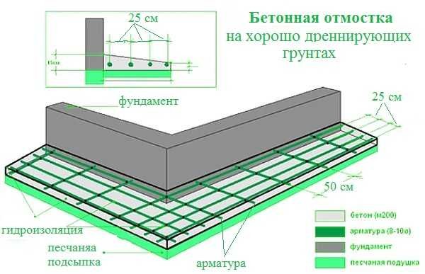 La technologie de fabrication de la zone aveugle est choisie en fonction du type de sol, de la profondeur de sa congélation, de l'architecture du bâtiment et du climat ambiant.