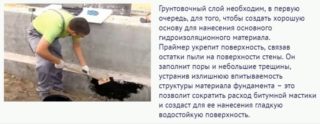 - Apprêt. La base est traitée avec un apprêt, une composition liquide à base de bitume. Ils l'achètent dans les quincailleries ou ont élevé du mastic existant. La pénétration du primaire dans les pores du béton assure une adhérence de haute qualité de l'imperméabilisation et du support, et réduit la consommation de matière.