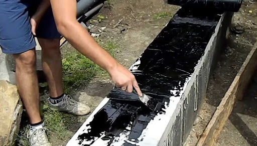 - Imperméabilisation. Le récipient avec la composition est ouvert avant utilisation. Les experts conseillent de réchauffer le mastic à 32-35° pour qu'il repose plus en douceur. Le matériau appliqué à chaud est chauffé à 150-180°. Appliquer la composition avec un pinceau ou un pinceau. La couche doit être uniforme, couvrir toute la structure sans lacunes. Le bitume est appliqué sur la fondation de haut en bas, les bandes se chevauchent. La deuxième couche et les suivantes sont étalées après séchage de la précédente. Pour les émulsions, le délai d'attente est de 5 heures, pour le reste d'environ 24 heures.