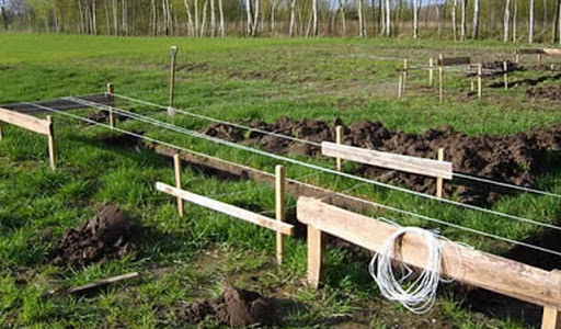 - Une corde est tendue le long des bords intérieur et extérieur de la fondation, les points de marquage sont retirés à distance en dehors de la zone de construction afin qu'ils restent intacts lors des travaux de terrassement.