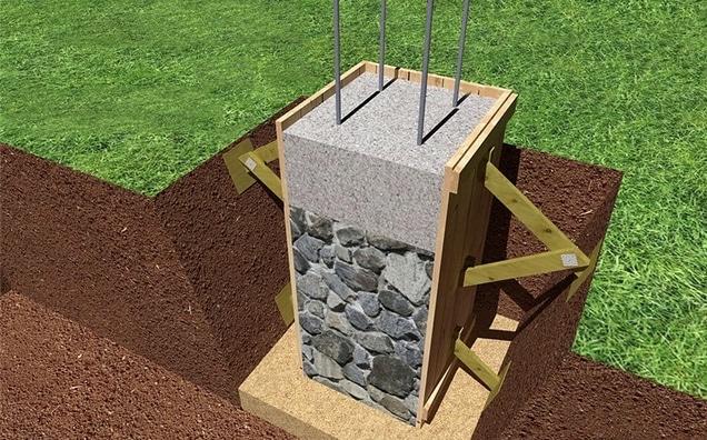 - Sous le support. Cette conception se distingue par un aspect présentable, car la maçonnerie est uniforme et les bords de la pierre sont clairement visibles. Pour créer, un gabarit (support) et une bouteille calibrée jusqu'à 25 cm sont utilisés.La base est érigée dans une tranchée en dessous du point de congélation et des piliers de moellons renforcés sont réalisés dans les coins. Chaque rangée est saupoudrée de copeaux de pierre puis coulée avec du mortier de ciment pour qu'elle reste à l'intérieur. L'affaissement sur la surface extérieure est immédiatement éliminé.