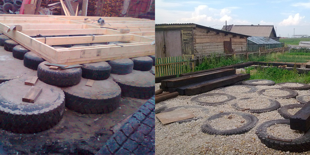 Du sable humide, exempt de débris, est versé à l'intérieur des pneus et dans les intervalles entre eux. Une sorte de base a une capacité portante suffisante pour résister à une maison de campagne sans fondation.