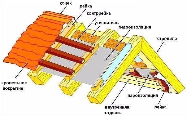 Pour le toit, un système de poutres, de dalles ou de petites fermes est utilisé. Le matériau du sol est le métal, le bois, le béton armé. Sur des chevrons en bois, une caisse de barres d'une section de 50x50 mm est placée pour la fixation de l'ardoise, de l'onduline, des tuiles métalliques. Un isolant, un pare-vapeur et une couche de protection contre l'humidité sont placés sous le revêtement.
