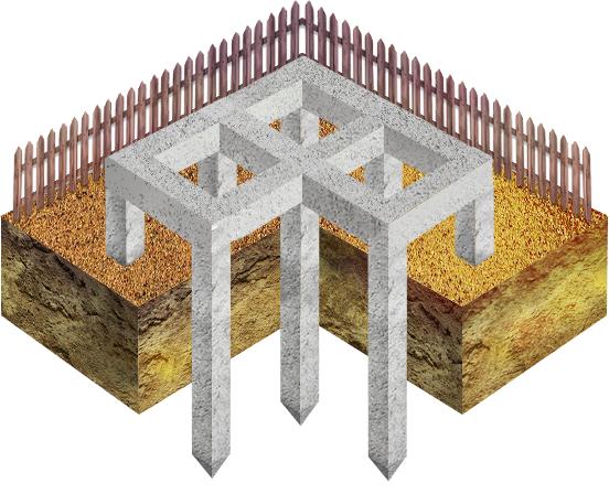La fondation se compose de plusieurs pieux profondément ancrés, reliés entre eux par un grillage, sur lesquels les murs sont construits.